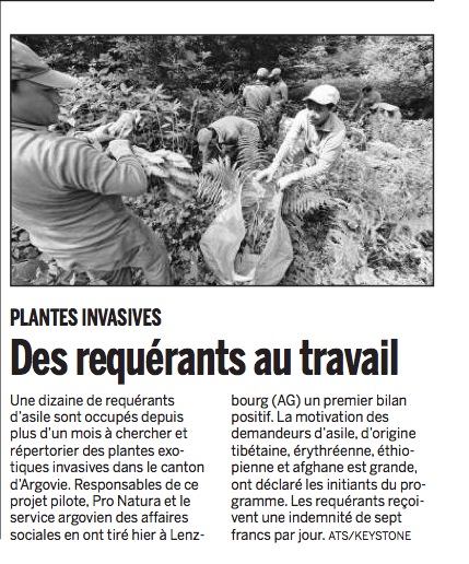 Le Courrier du 10 juillet 2013 intitulait ainsi un article concernant un projet conjoint de Pro Natura et du Service argovien des affaires sociales: « Des requérants au travail » (v. image ci-dessous).
