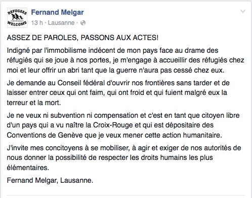 Fernand Melgar, « indigné par l’immobilisme indécent de [son] pays face au drame des réfugiés qui se joue à nos portes », s’engage à accueillir des réfugiés chez lui. Il invite ses concitoyens, dans un post publié sur sa page Facebook, à faire de même.