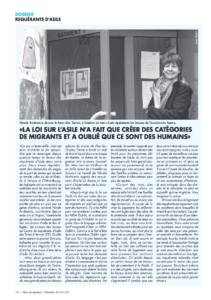 Le nº 222 de décembre 2015 du journal de l’ASLOCA, Droit au logement, a interviewé Nicole Andreetta, aumônière à l’AGORA: «La loi sur l’asile n’a fait que créer des catégories de migrants et a oublié que ce sont des humains». Son témoignage, que vous pouvez lire ci-dessous, accompagne un large extrait du décryptage thématique sur l’hébergement que Vivre Ensemble a publié en février 2015 (VE 151) dans le cadre du projet Comptoir des médias: Hébergement | Médias et public trompés par la rhétorique de la hausse des demandes d’asile.