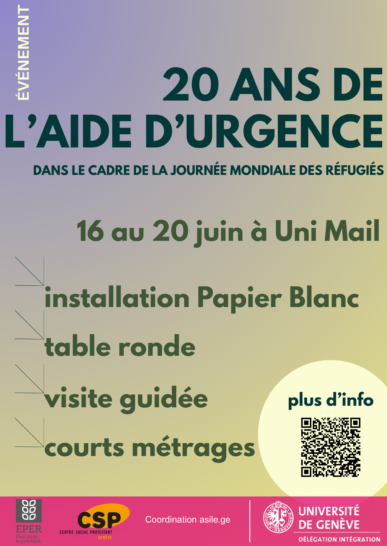16 -> 20 juin | Genève Uni Mail. A l’occasion de la Journée mondiale des réfugiés, l’Université de Genève, le CSP Genève, l’EPER, la Coordination asile.ge organisent une semaine de sensibilisation et d’information au sein de l’Université de Genève sur la thématique de l’aide d’urgence. En parallèle de l’installation immersive «Papier Blanc» visible toute la semaine dans le hall d’Uni Mail, plusieurs événements et animations sont proposés afin de sensibiliser le public aux réalités de l’aide d’urgence à Genève.