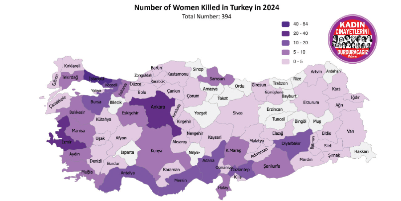 La violence à l’égard des femmes fondée sur l’inégalité des sexes, qui existe dans le monde entier, ne cesse de s’aggraver en Turquie depuis des années. En juillet 2021, la Turquie s’est retirée de la Convention du Conseil de l’Europe sur la prévention et la lutte contre la violence à l’égard des femmes et la violence domestique, connue sous l’appellation « Convention d’Istanbul ». Depuis ce retrait, la violence à l’égard des femmes a encore augmenté. Selon les données enregistrées par la plateforme « Nous allons arrêter les féminicides » (voir encadré), 2024 a été une année record, avec 394 femmes assassinées et 259 femmes ayant perdu la vie dans des circonstances suspectes.[1]Rapports annuel et semestriel de féminicides de la plateforme Nous allons arrêter les féminicides (2024/1er sem. 2025)
