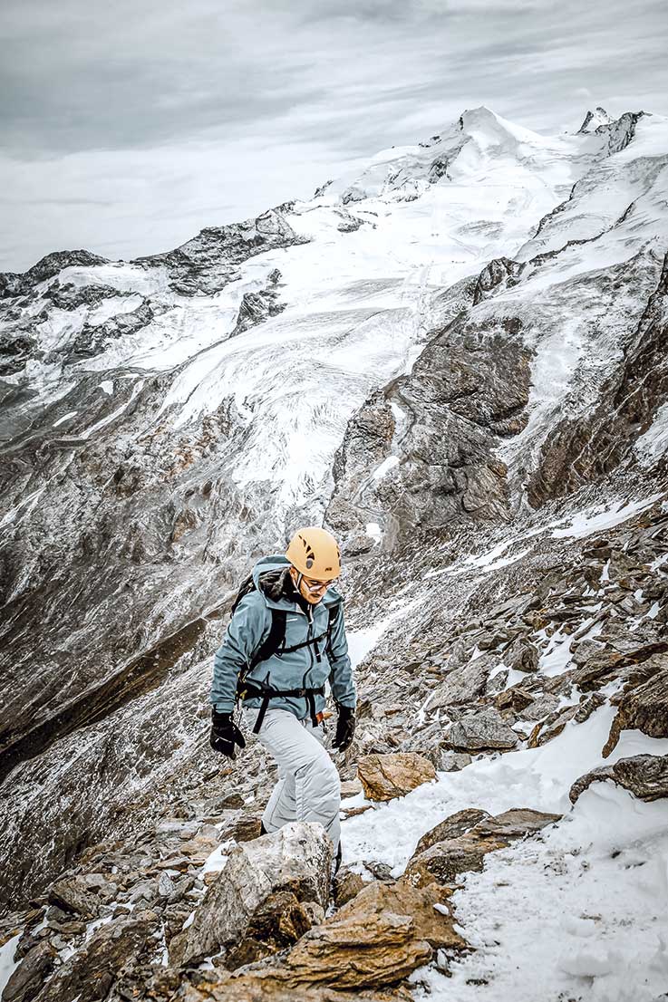 La nuit passée dans la cabane à 3500 mètres d’altitude, après le premier jour de marche, je ne l’oublierai jamais. Nous étions ensemble, nous avons bu, mangé et beaucoup ri. C’était une déconnexion totale où nous étions dans le moment présent, un petit coin de paradis. Dans le groupe, tout le monde n’avait pas forcément le même niveau. Les guides s’en sont rendu·es compte. Ils nous ont donc demandé pendant la soirée si on voulait diviser le groupe en deux pour monter le Nadelhorn. On a refusé, on voulait rester ensemble. On a donc décidé de faire le sommet d’à côté, qui est un peu moins haut.
