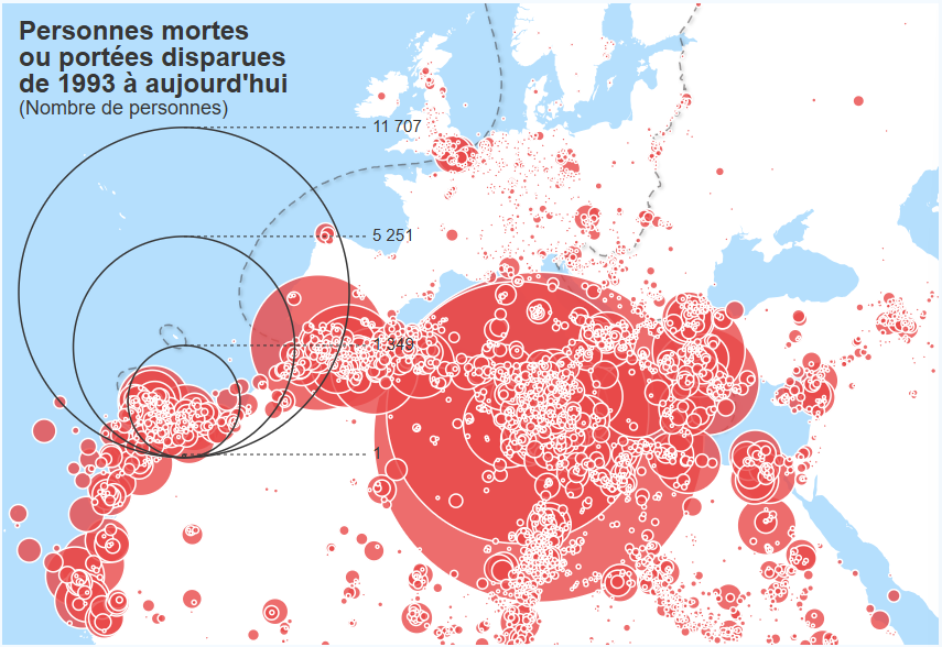 Les données utilisées ici sont issues de 3 sources de données. Les données de 1993 à 1999 sont issues de l’association UNITED for Intercultural Action, une organisation européenne de solidarité avec les migrants. Les données de 2000 à 2013 sont issues du projet de data journalisme » The Migrants Files« , une initiative journalistique qui a collecté des données sur les morts de migrants à travers le monde. Enfin, les données de 2014 à aujourd’hui sont issues de l’Organisation Internationale pour les Migrations (OIM), qui collecte des données sur les morts de migrants à travers le monde.