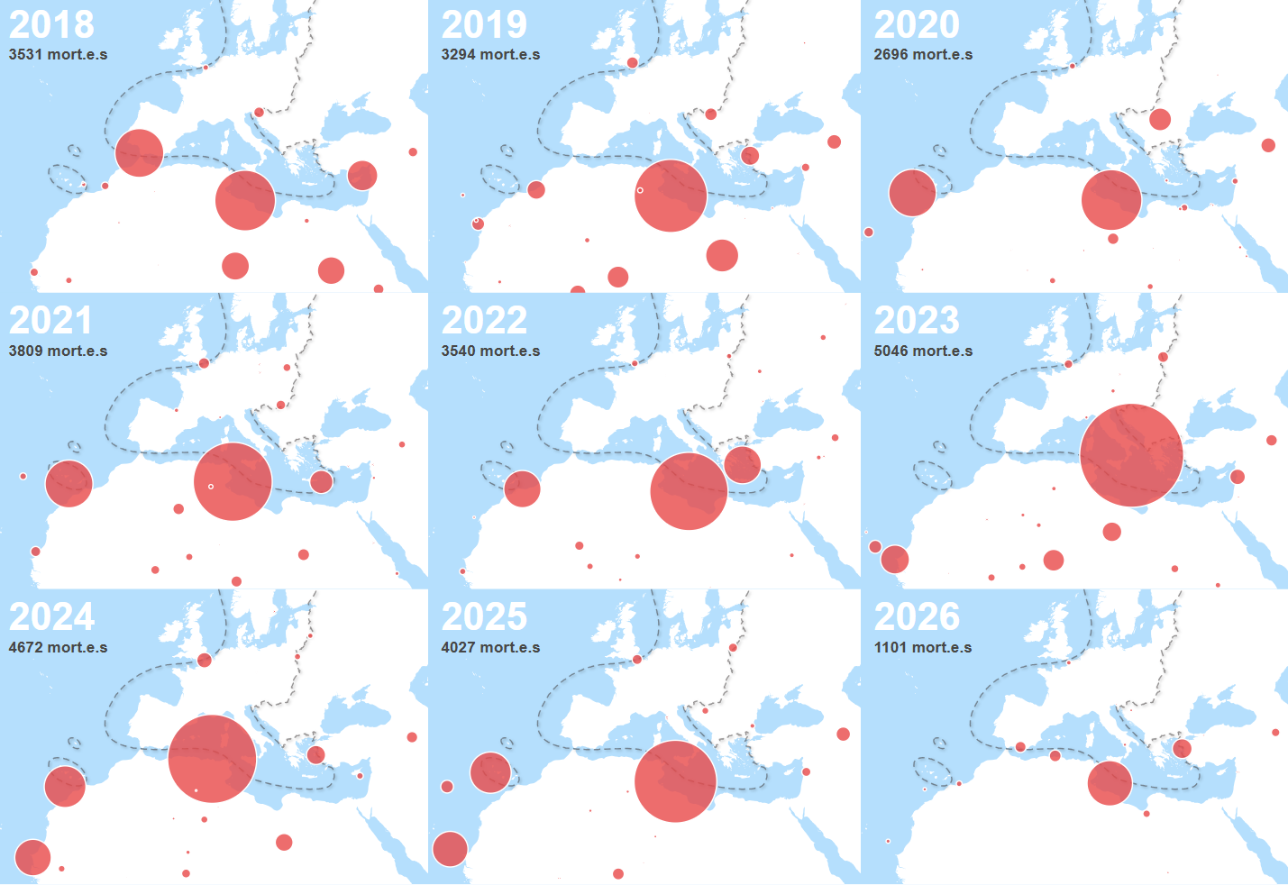 Entre le 1er janvier 1993 et 17 avril 2026, 76 000 personnes sont mortes en migration en tentant de rejoindre l’Europe. Nous relayons l’article du géographe et cartographe Nicolas Lambert, publié sur le site Neocarto, qui propose des cartes systématiquement actualisées des morts aux frontières européennes. À l’aide de plusieurs cartes interactives, son article nous permet de mieux comprendre la géographie de ces décès – notamment les zones où ils sont les plus nombreux, leur évolution au fil des années, ainsi que les causes principales de ces morts.