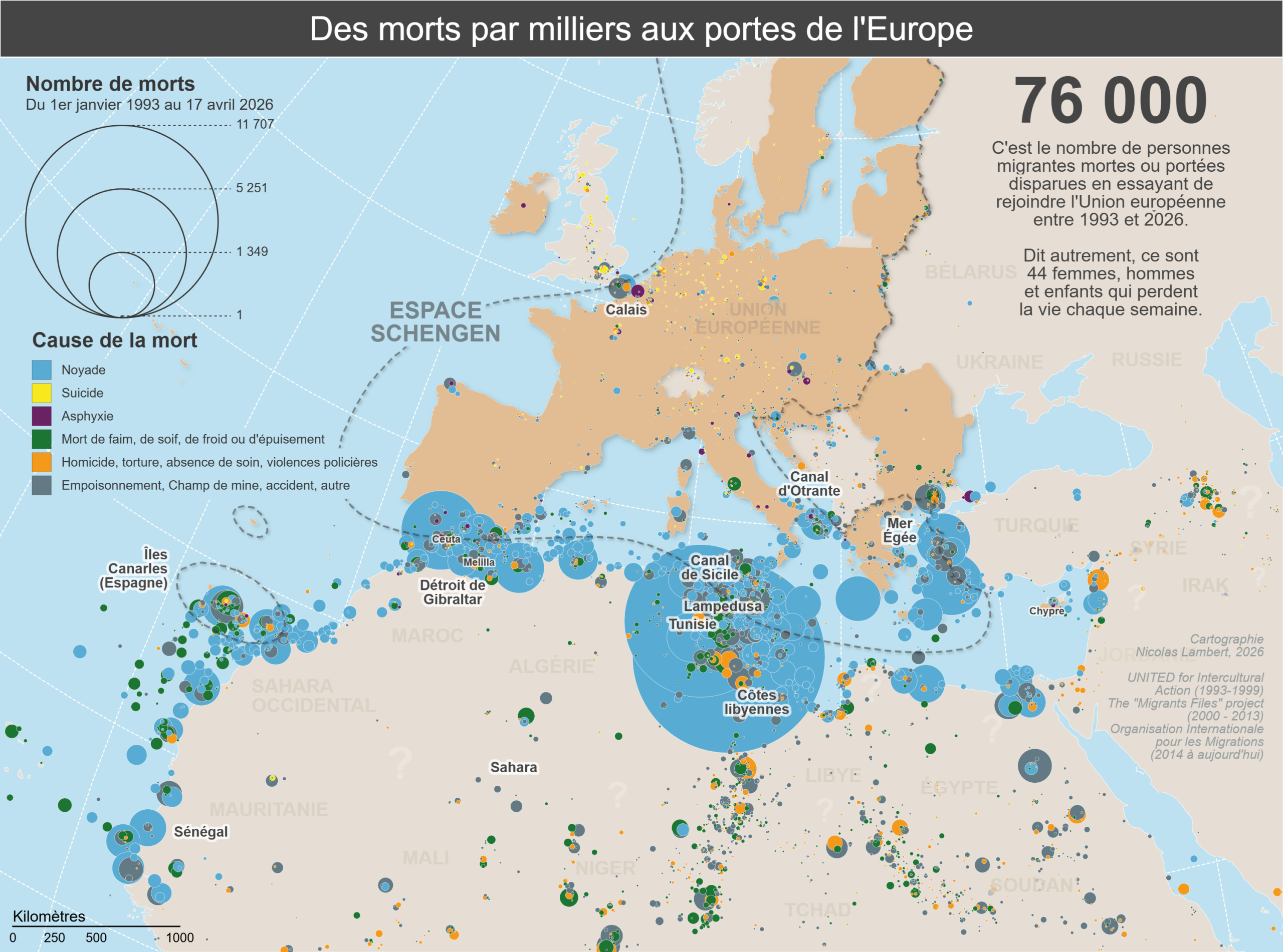 Entre le 1er janvier 1993 et 17 avril 2026, 76 000 personnes sont mortes en migration en tentant de rejoindre l’Europe. Noyades, asphyxies, accidents, écrasements, empoisonnements, explosions sur des champs de mines, morts de faim, de soif, d’épuisement, absence de soins médicaux, violences policières, etc. autant de tragédies humaines qui auraient pu être évitées.