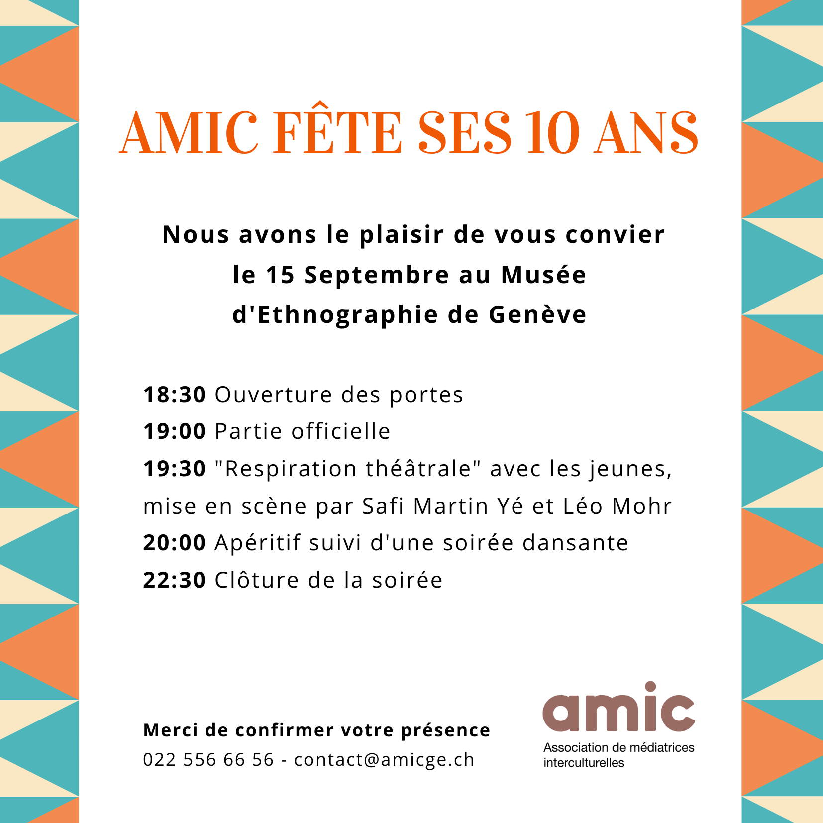Cela fait maintenant 10 ans que l’association de médiatrices interculturelles (AMIC), s’engage pour faciliter l’intégration des réfugié·es et migrant·es à Genève. (www.amicge.ch) L’association vous invite le 15 septembre dès 18h30 jusqu’à 22h30 pour célébrer cet anniversaire. Au programme : une pièce de théâtre, un apéritif et pour finir une soirée dansante. Des informations plus précises se trouvent sur la carte d’invitation ci-dessous. Cette fête sera l’occasion de se retrouver et rencontrer toutes les personnes qui, d’une manière ou d’une autre, font vivre l’AMIC. Pour faciliter l’organisation, merci de confirmer votre présence ainsi que celles des personnes qui vous accompagneront.