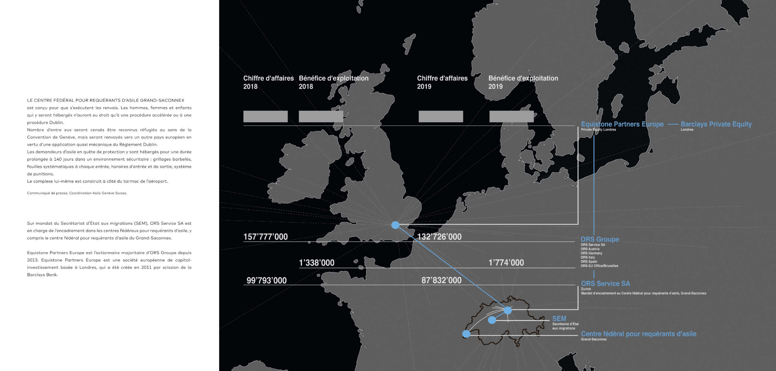 Le travail de la photographe Gabriela Löffel se concentre principalement sur la question des structures financières actives dans le domaine de l’asile (ORS et autres), qui génèrent des capitaux à l’aide de divers instruments de l’industrie de la finance mondiale.