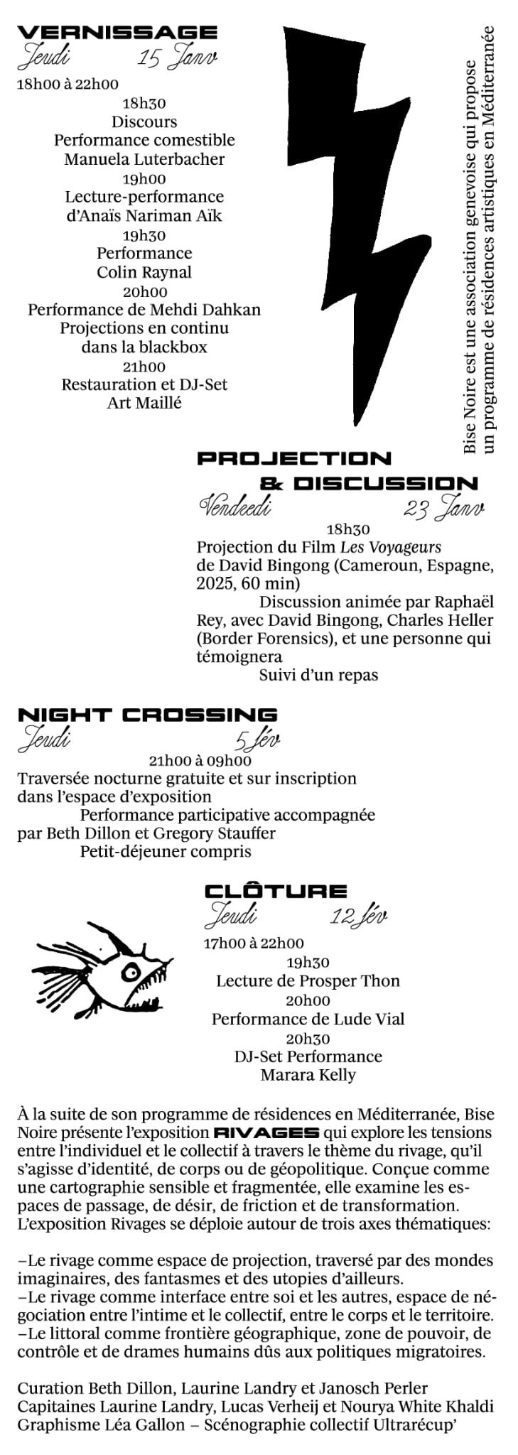 L’exposition collective Rivage mise sur pied par l’association genevoise Bise Noire accueille vendredi 23 janvier une soirée autours des frontières. L’évènement s’articulera autours du film Les Voyageurs de David Bingong et sera suivi d’une discussion en présence du réalisateur et de Charles Heller, de Border Forensics. Une personne viendra également témoigner de son passage par les Balkans, la lutte contre son renvoi vers la Croatie et maintenant vers son pays d’origine. L’évènement est suivi d’un repas.
