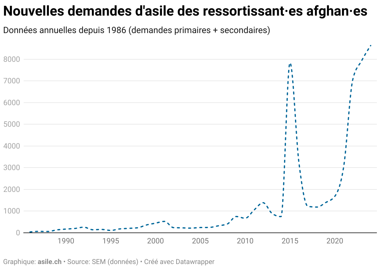 Durant longtemps, les demandes d’asile des ressortissant·es en Suisse se situaient à un niveau relativement modeste, quelques centaines par an. Elles ont commencé à augmenter vers 2009, au moment où la situation sécuritaire en Afghanistan se détériore. Le pic de 2015 correspond à l’ouverture de la route des Balkans, date à laquelle les demandes d’asile ont considérablement augmenté en Suisse, comme dans l’ensemble de l’Europe. Les demandes des Afghan·es représentent environ 20% du total des nouvelles demandes d’asile. La prise de pouvoir des talibans en 2021 a poussé de nouvelles personnes à fuir le pays. Si la majorité a trouvé refuge dans les pays limitrophes, une petite partie a cherché une protection en Suisse.
