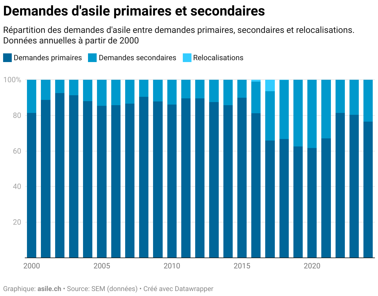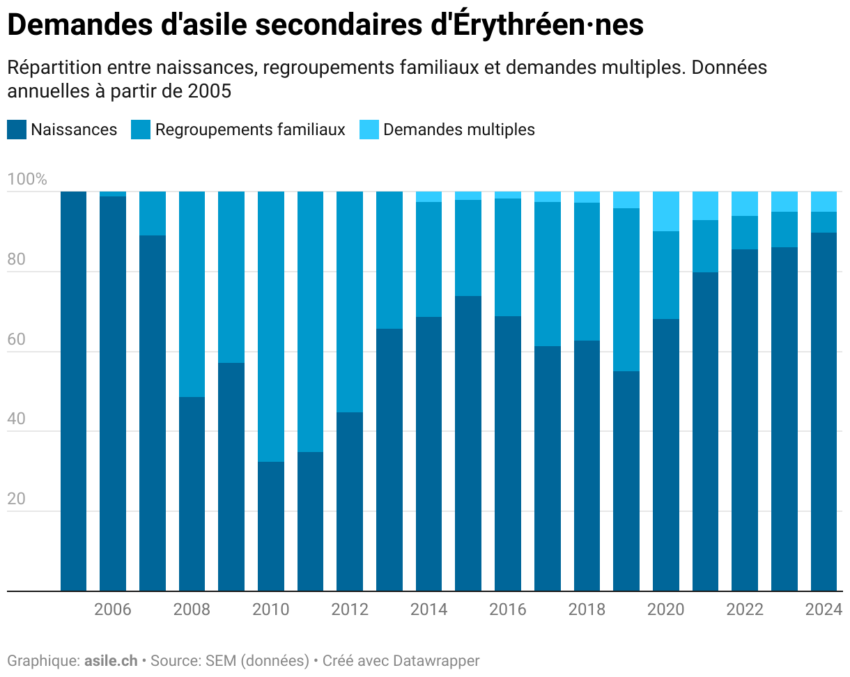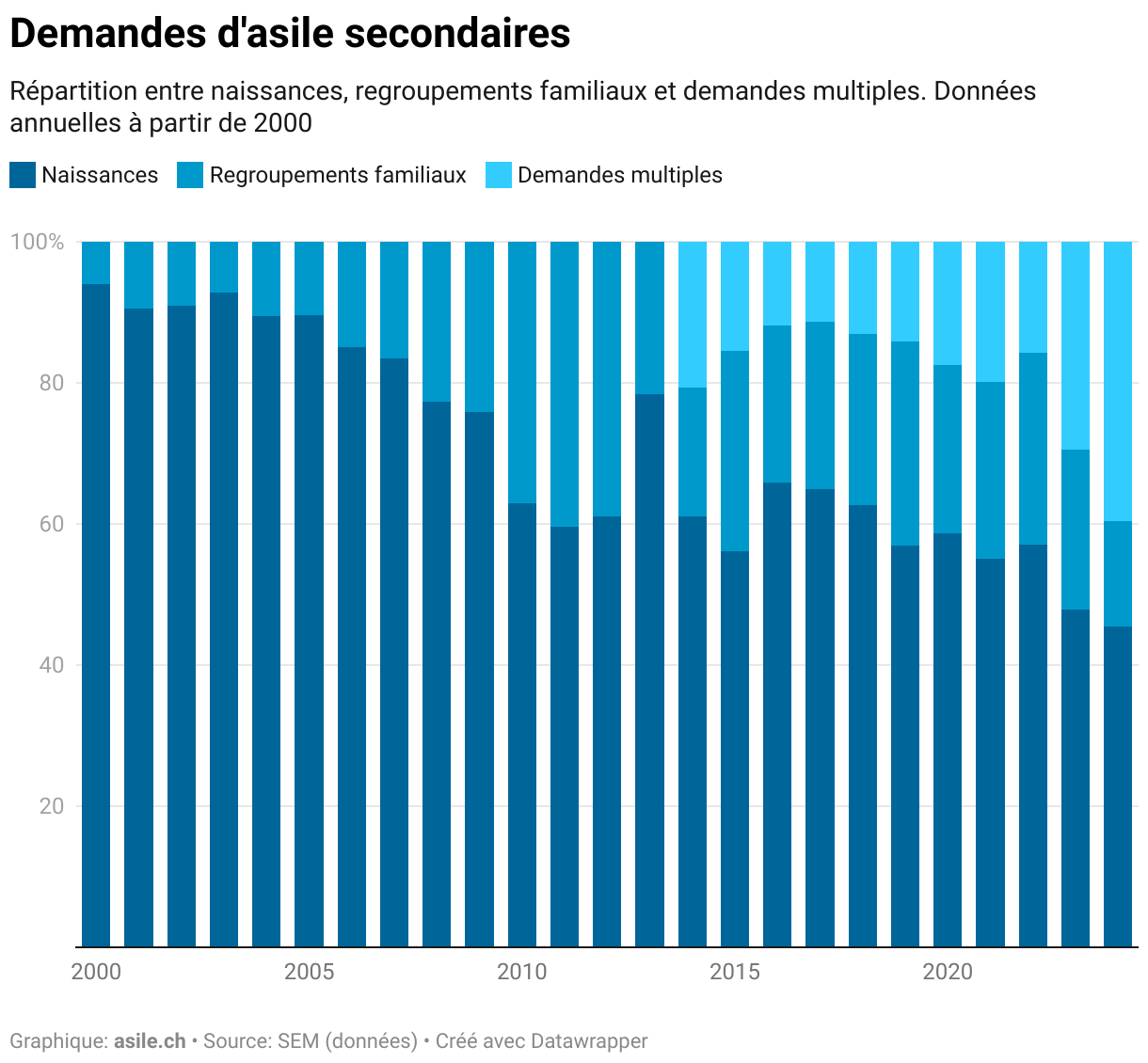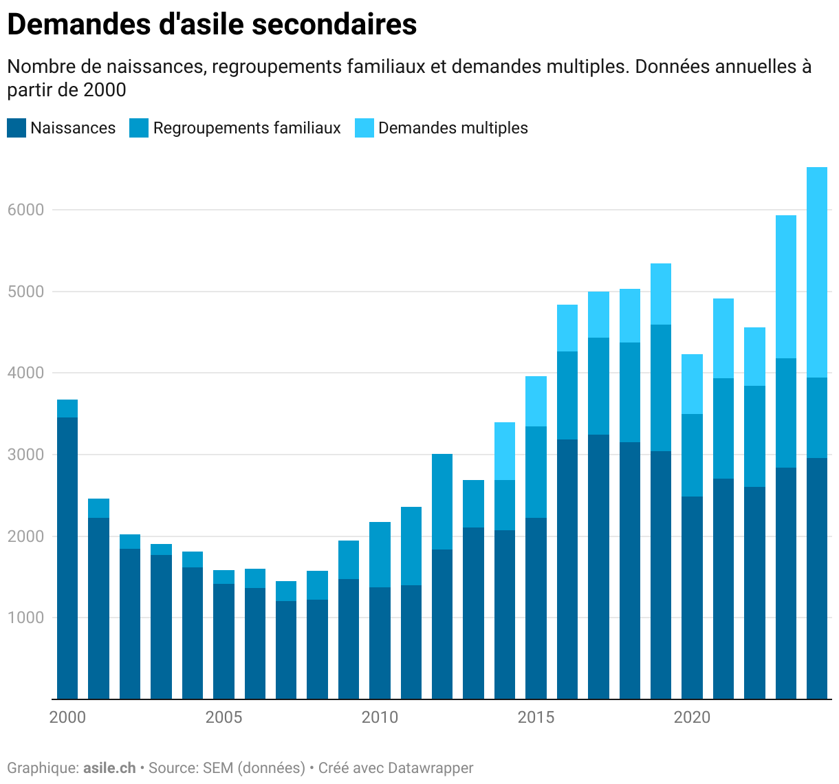 En 2024, de ces 1169 demandes secondaires la majeure partie (90%) 1050 des demandes comptabilisées sont des naissances d’enfants de personnes arrivées en Suisse dans le cadre de l’asile et étant en procédure ou ayant déjà obtenu une protection.