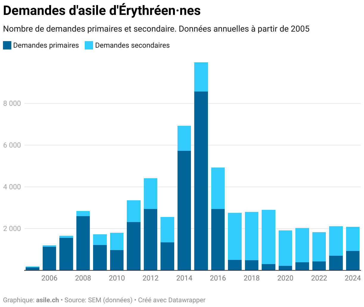 Nous observons un nombre très faible de demandes d’asile de ressortissant·es érythréen·nes jusqu’au milieu des années 2000. La guerre avec l’Éthiopie, l’état d’urgence décrété en 1998 et l’autoritarisme croissant de la dictature d’Aferwerki conduisent à des violations systématiques des droits humains. De nombreux Érythréens quittent le pays afin de trouver refuge dans les pays voisins et lointains.