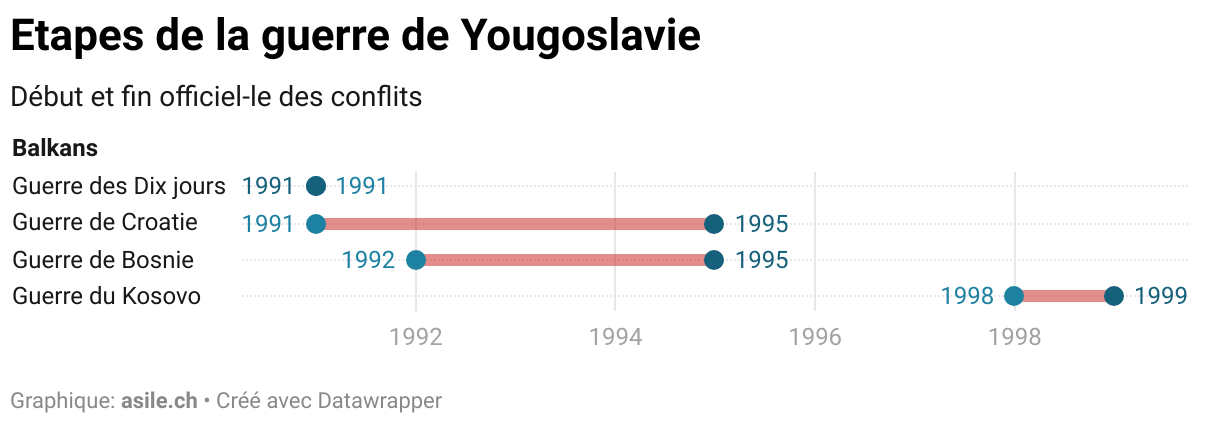 La fin de la république fédérative socialiste de Yougoslavie est accompagnée d’une série de conflits entre 1991 et 2001 (voir Timeline ci-dessous). Ces guerres ont provoqué des milliers de victimes – on estime le nombre de mort·es à 140’000 ainsi qu’environ 2,4 millions de réfugié·es et 2 millions de déplacé·es. Une majorité s’est déplacée à l’intérieur de leur pays ou dans un pays voisin : la Croatie a accueilli près de 750’000 réfugié·es du Kosovo, de Bosnie-Herzégovine et des déplacé·es internes.