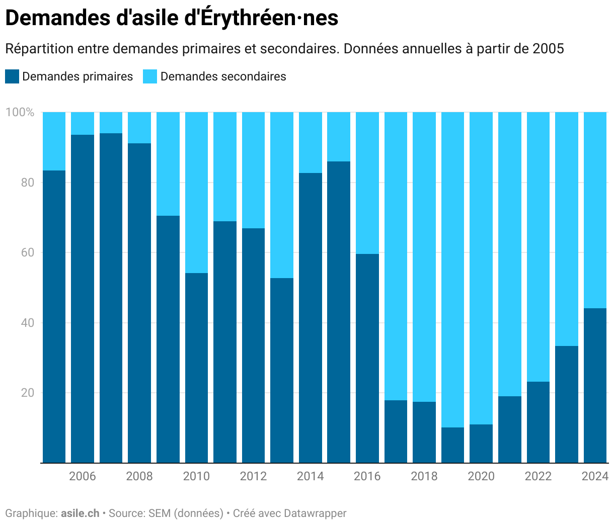 Selon la nationalité les demandes secondaires peuvent constituer une part importante des chiffres des « nouvelles demandes d’asile » et donc gonfler les chiffres de manière importante. Tel est le cas pour les données relatives aux ressortissant·es Erythréen·nes.