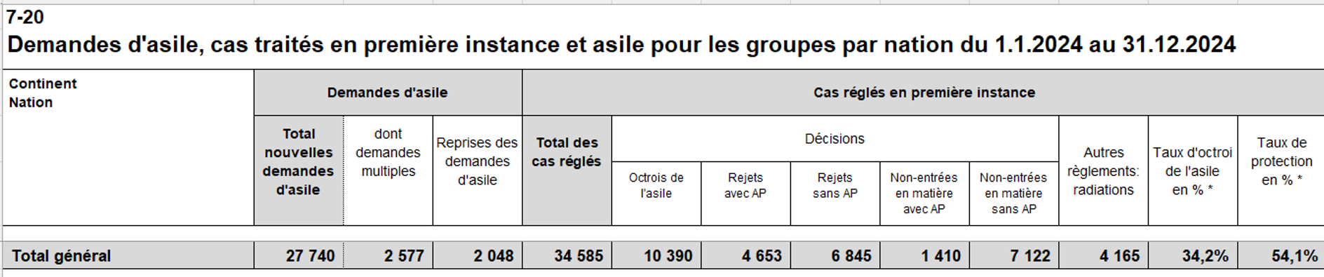 A noter que le tableau «7-20: Demandes d’asile, cas traités en première instance et asile pour les groupes» recense les décisions prises par les autorités sur les demandes d’asile. Ces informations sont utilisées pour mesurer le taux d’octroi d’asile, le nombre de rejets, etc. Les catégories sont expliquées ci-dessous: